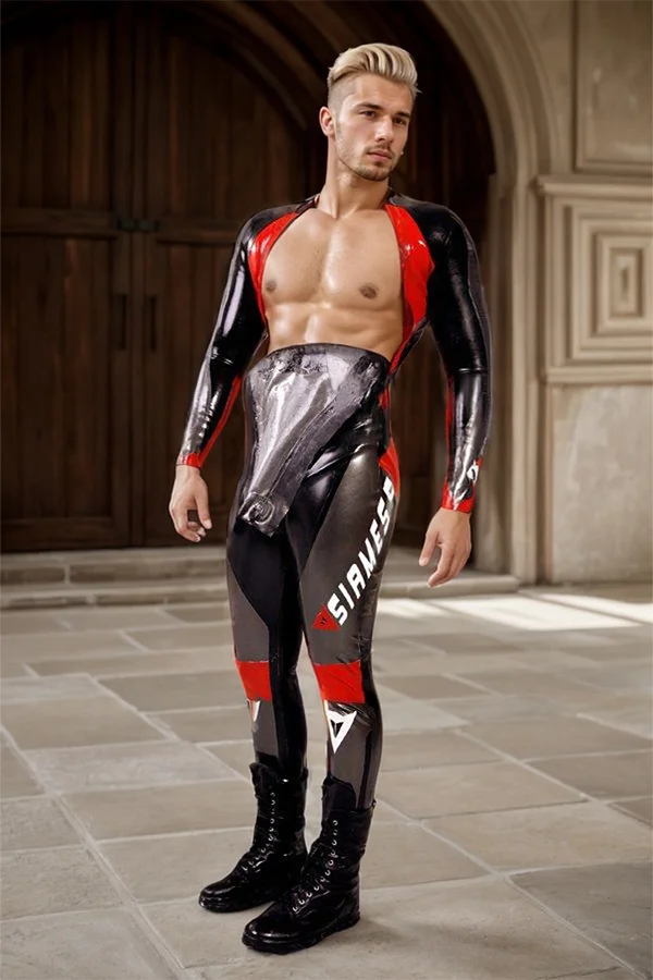 Dominate the track in this Men's T-Age Motorcycle Racing Latex Catsuit V18. This piece is a powerful tribute to high-octane performance and aggressive style. Crafted from high-gloss 0.40mm natural latex, it molds to your body, creating a second-skin feel that's both exhilarating and form-flattering.